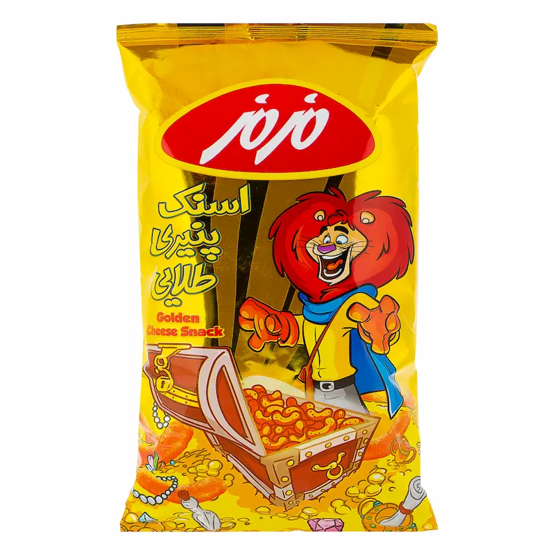 اسنک طلایی ۶۰ مزمز از جمله محصولات کلاسیک و خاطرهانگیز این برند است که بر پایه بلغور ذرت تهیه میشود. این اسنک با رنگ نارنجی جذاب و طعم پنیری غنی، دارای بافتی بسیار ترد و در عین حال ذوبشونده در دهان است. “طلایی ۶۰” با استفاده از روغنهای گیاهی مرغوب و پنیر باکیفیت طعمدار شده و به دلیل فرآیند پخت استاندارد، فاقد اسیدهای چرب ترانس مضر است. بستهبندی متالایز آن کمک میکند تا تردی و طعم محصول تا زمان مصرف به خوبی حفظ شود. این محصول گزینهای عالی برای میانعده، دورهمیها و تماشای فیلم محسوب میشود.