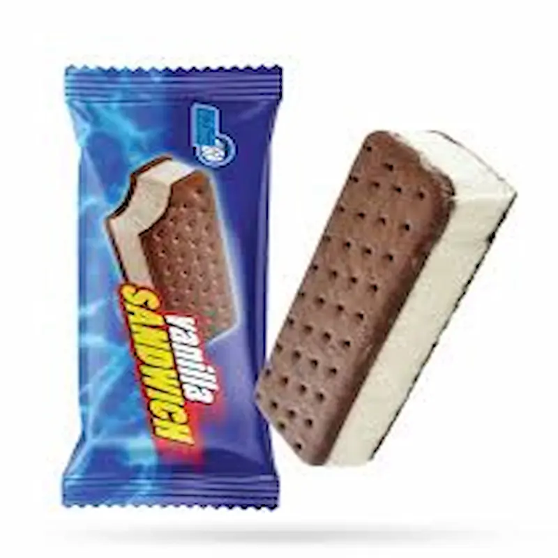 بستنی ساندویچی کلاسیک میهن. لایهای ضخیم از بستنی وانیلی بین دو نان نرم کاکائویی.