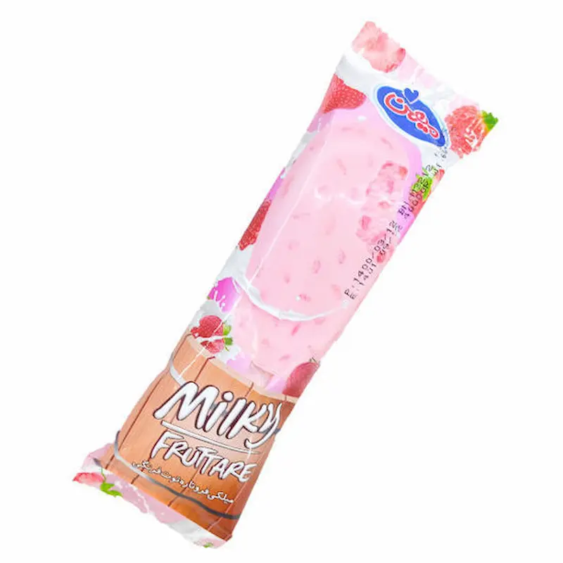بستنی چوبی با روکش یخی میوه‌ای (شیر، توت فرنگی و انبه). ترکیبی استوایی و خنک.