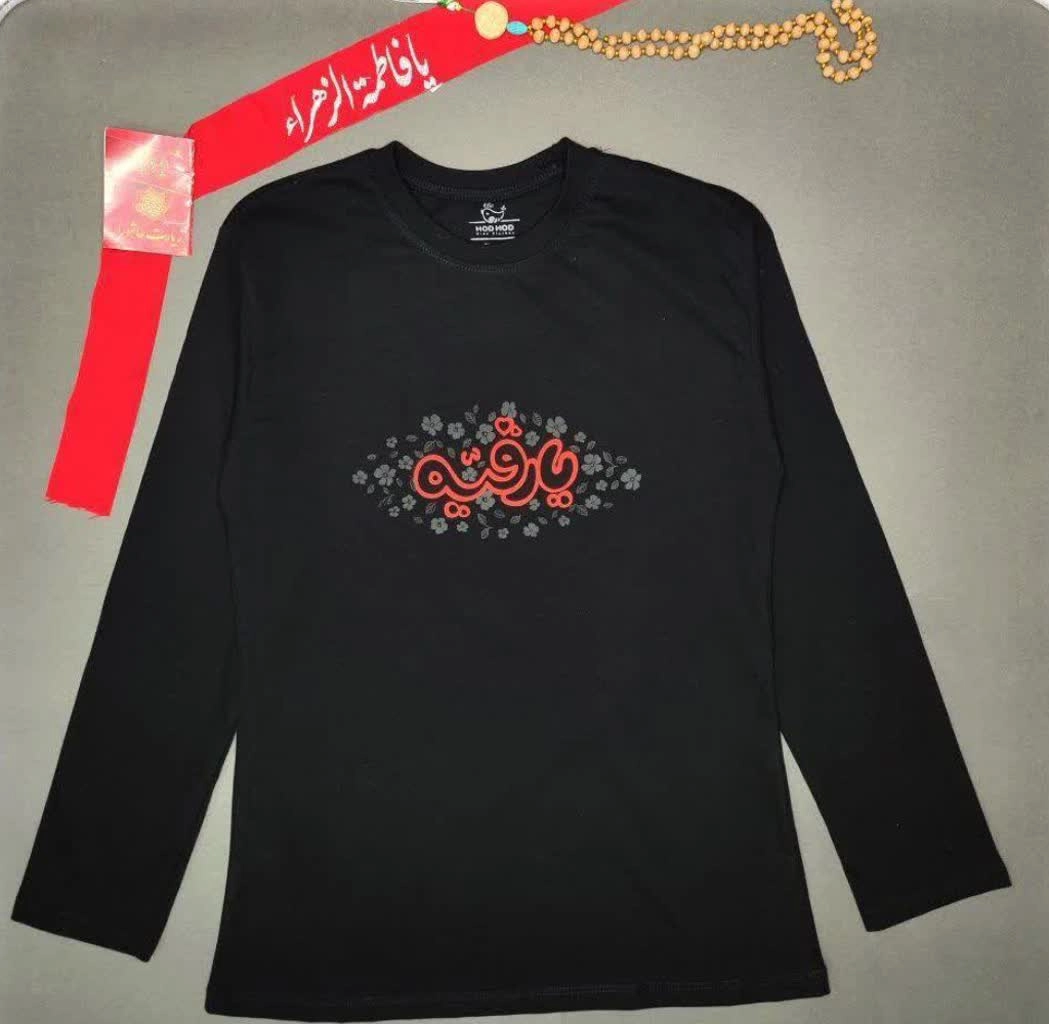 بلوز آستین بلند بچگانه با چاپ «یا رقیه» و طرح گلهای محرم، انتخابی معنوی و خاص برای ایام عزاداری و مراسم مذهبی.