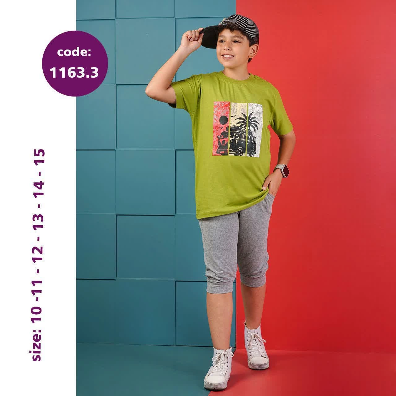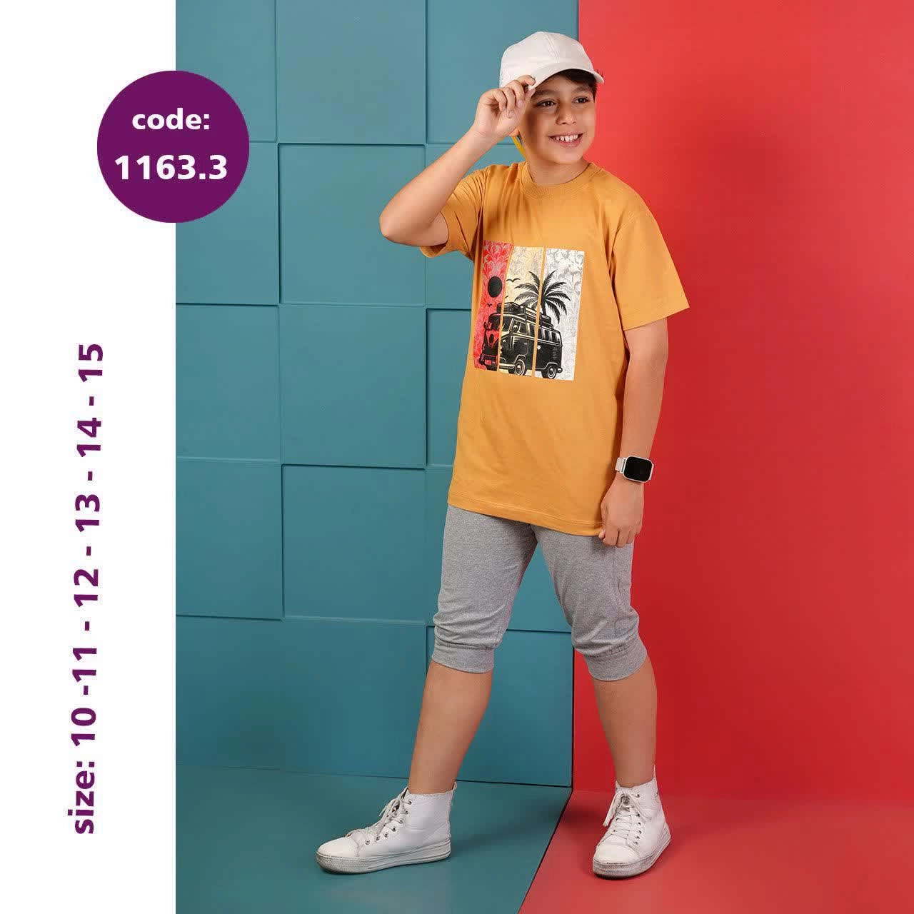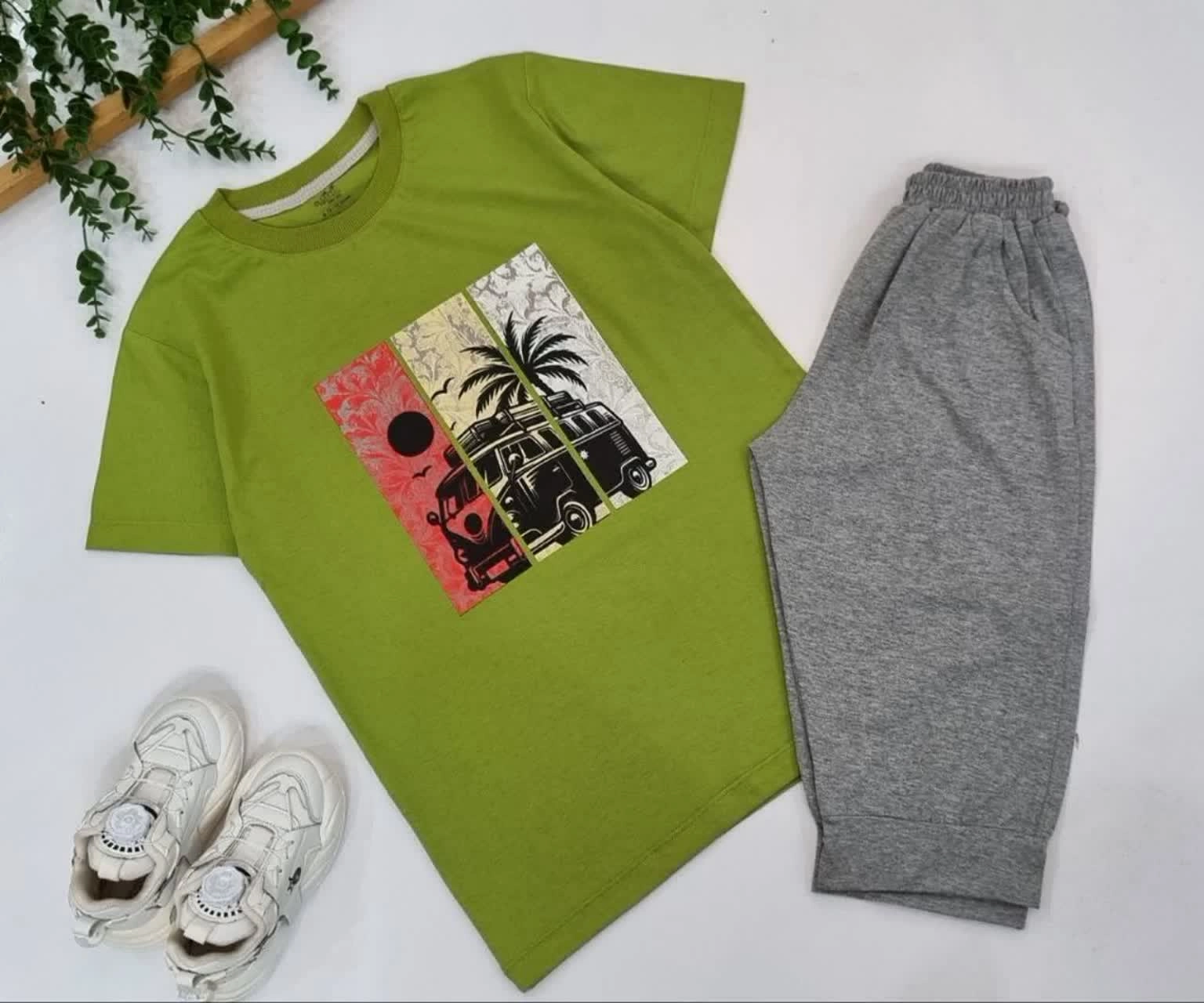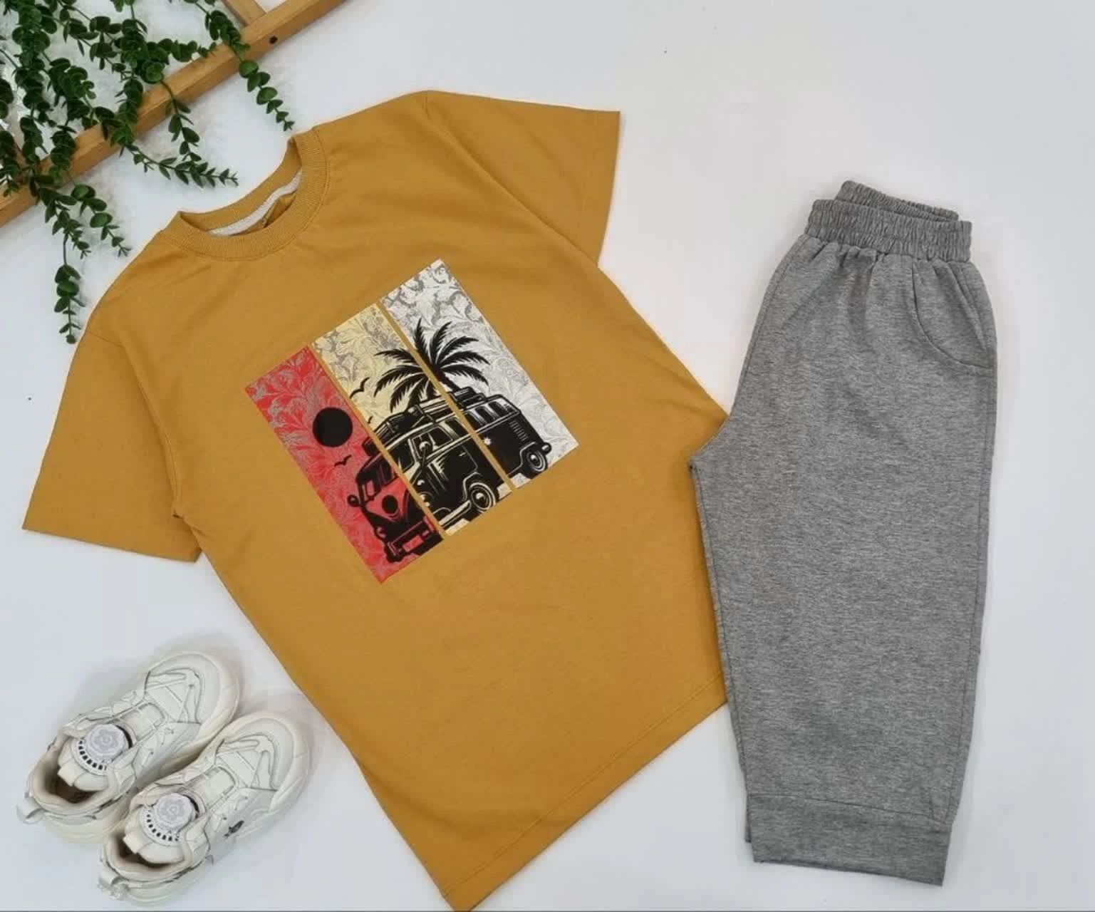 ست تیشرت و شلوارک بچگانه با چاپ گرافیکی اتوبوس کویر، انتخابی پرانرژی و خاص برای استایل تابستانی کودکان.