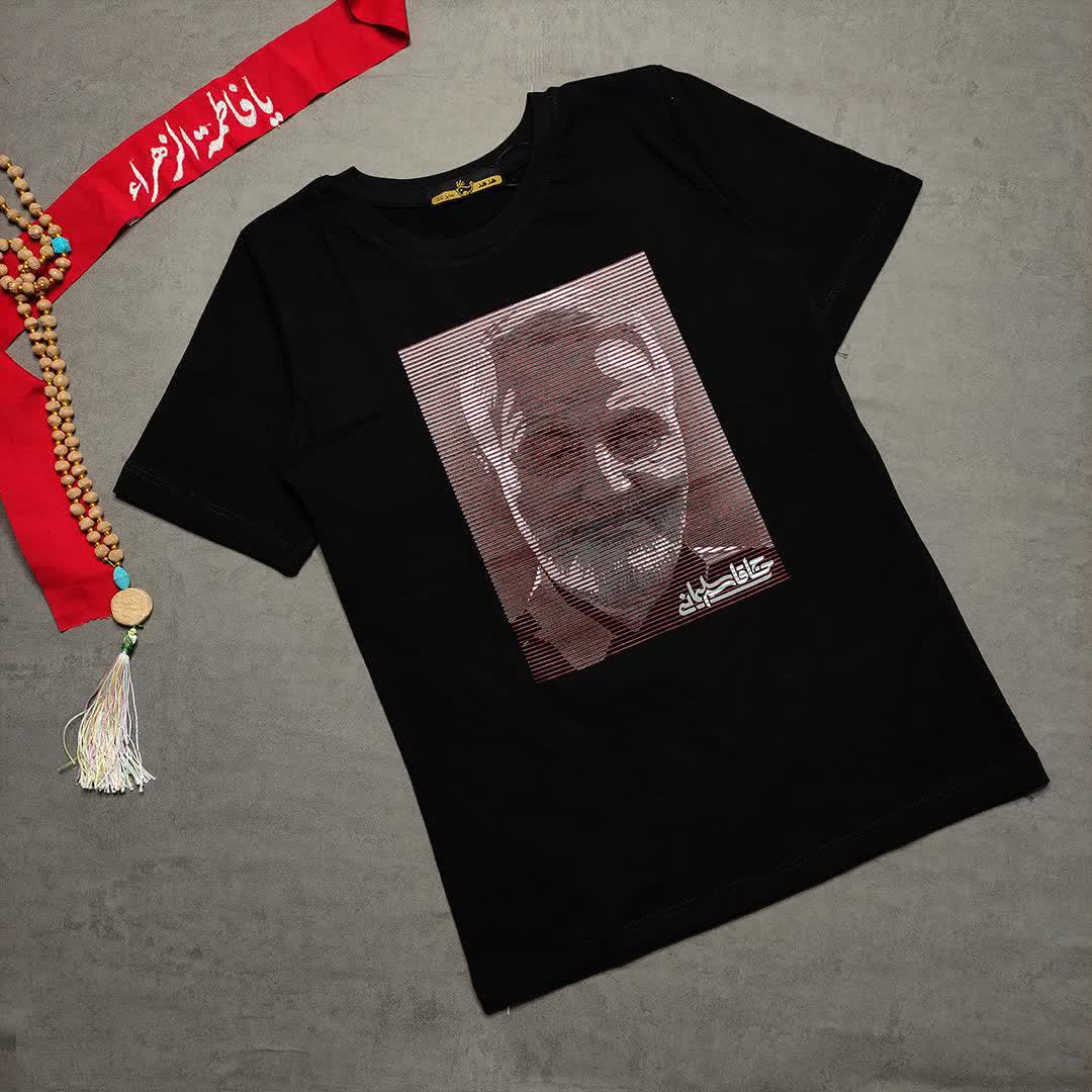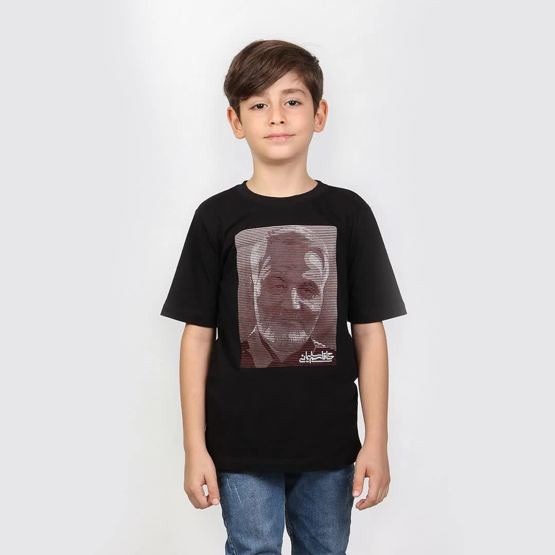 تیشرت مشکی بچگانه با چاپ چهره حاج قاسم، نمادی از افتخار، مقاومت و فرهنگ ایثار.