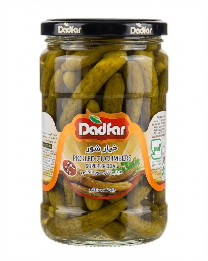 خیارشور سوپر ویژه 650 گرمی دادفر، ترد و خوش‌طعم، تهیه‌شده از خیار تازه، مناسب کنار غذا و ساندویچ، بسته‌بندی بهداشتی، باکیفیت و تازه، انتخابی عالی برای پذیرایی و مصرف روزانه.