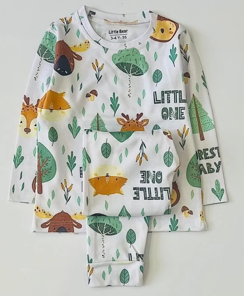 ست بلوز و شلوار بچگانه با چاپ فانتزی حیوانات جنگلی، انتخابی ایدهآل برای راحتی و نشاط کودک در خانه و خواب.