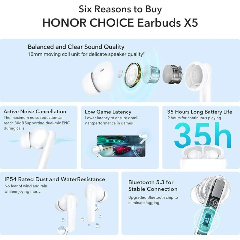 Honor (آنر) از معدود برندهایی است که همیشه به طراحی ساده و مینیمال معتقد و پایبند بوده است و همواره آن را به بهترین نحو پیاده سازی می‌کند. هندزفری بلوتوث دوتایی HONOR CHOICE Earbuds X5 جدیدترین هندزفری بلوتوثی Honor که در May 2023 تولید شده، نیز از این قاعده مستثنی نیست و طراحی بسیار ساده و یکدستی دارد. هنگام اتصال پنجره ای جهت اتصال سریع برای شما باز میشود و به شما امکان اتصال همزمان به دو دستگاه هوشمند را داده و امکان جابجایی یکپارچه بین تلفن های همراه، تبلت ها و رایانه های شخصی راه پیشتیبانی میکند. در هر کجا که هستید، قابلیت Noise Cancellation می تواند نویز خارجی را مسدود کند و صدای هدف را در طول تماس شناسایی و جدا کند. زمانی که هدفون به دستگاه تلفن همراه شما اتصال برقرار کرده باشد، شما می‌توانید از آن برای تولید صدا استفاده کنید تا مکان دقیق آن را در تلفن همراه خود تعیین کنید. به عبارت دیگر، این ویژگی به شما اجازه می‌دهد هدفون خود را پیدا کنید و از گم شدن آن جلوگیری کنید. این ویژگی می‌تواند به شما اطمینان و آرامش بیشتری بدهد زیرا شما می‌توانید هدفون خود را به راحتی پیدا کنید.