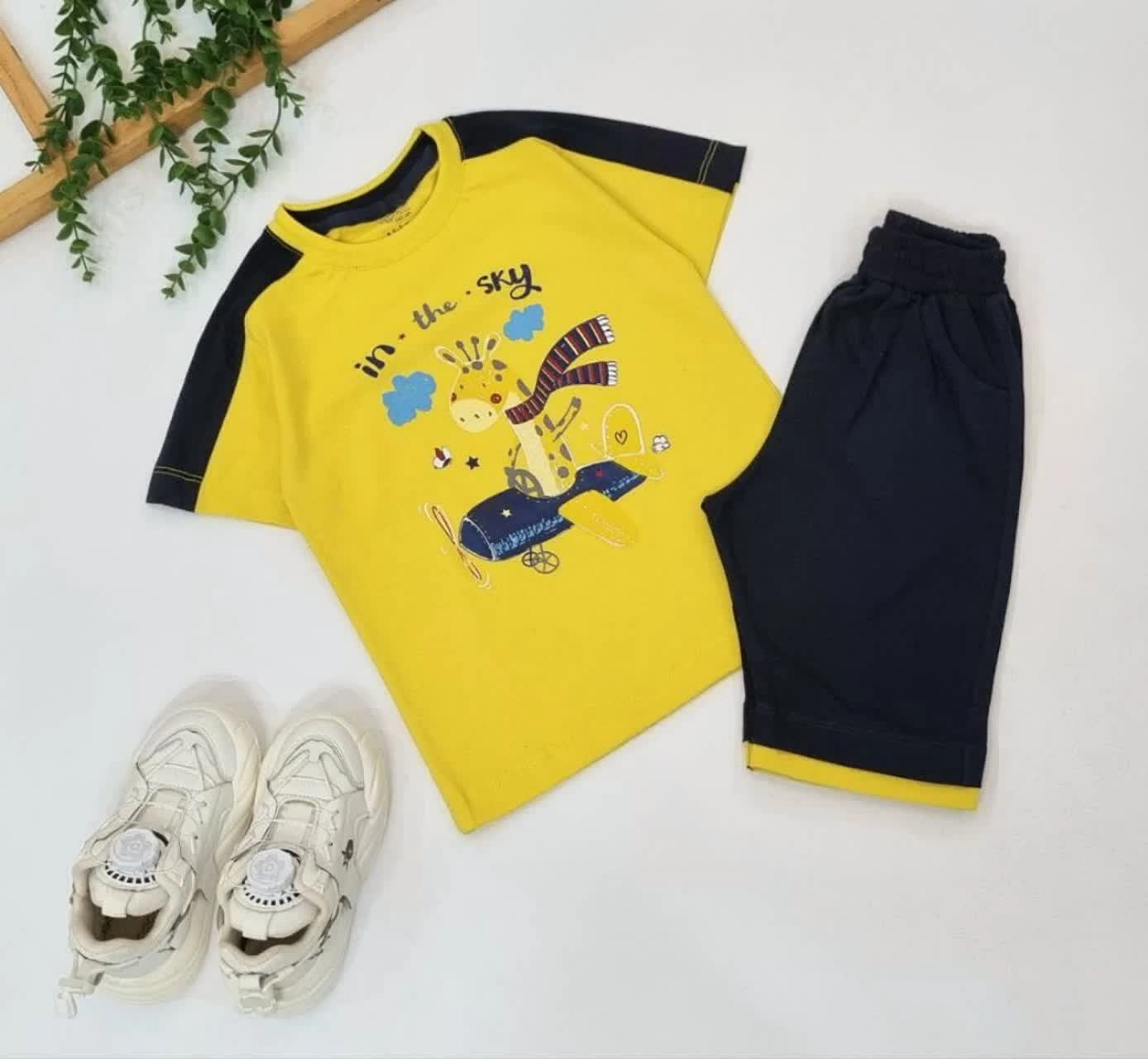 ست تی‌شرت و شلوارک بچگانه «خلبان زرافه» با چاپ فانتزی هواپیما و زرافه، انتخابی شاد و پرانرژی برای کودکان ماجراجو.